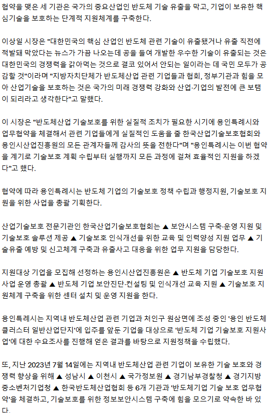 [오마이뉴스] 용인시, 반도체산업 기술보호·산업경쟁력 강화 지원체계 구축