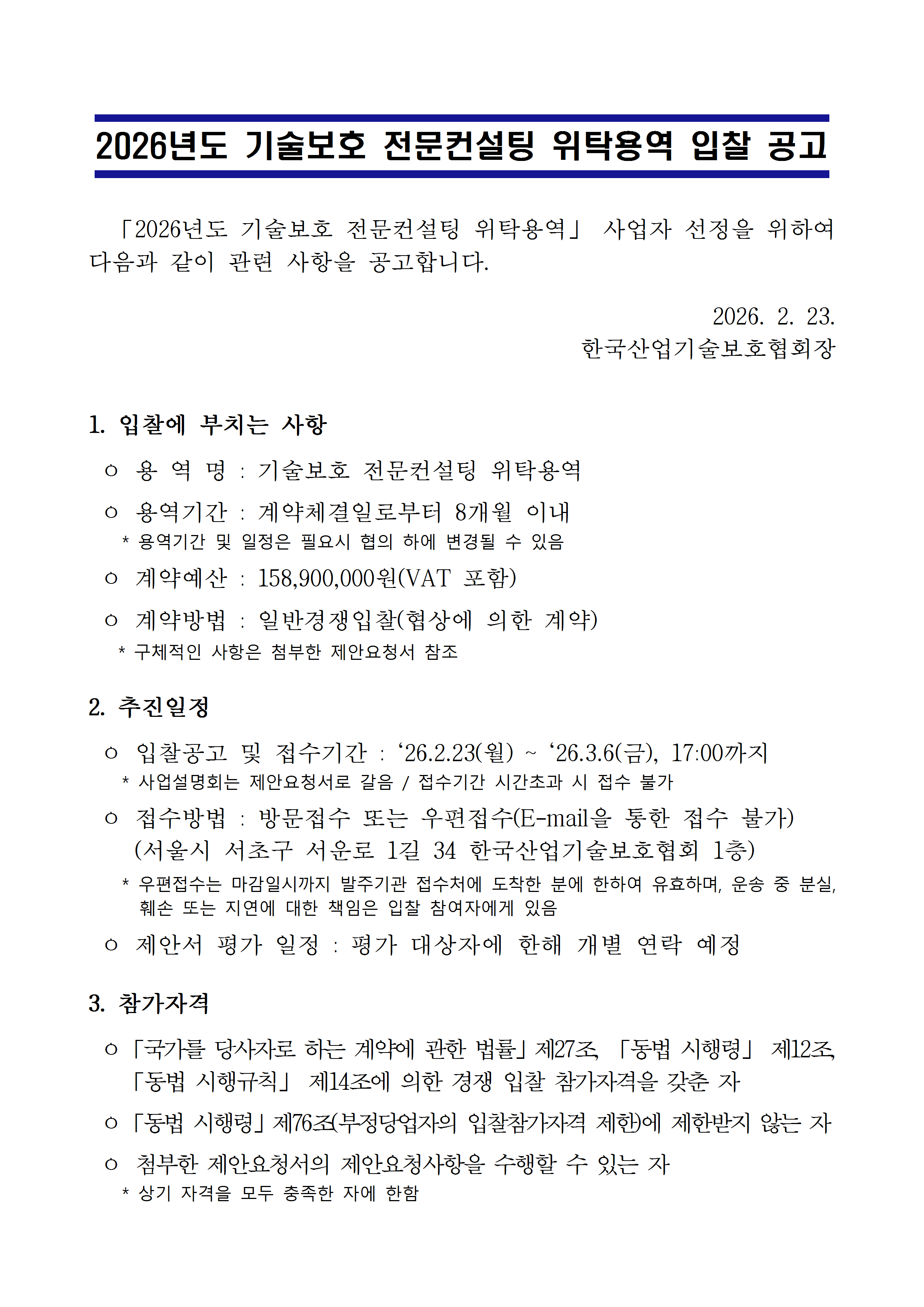 2026년도 기술보호 전문컨설팅 위탁용역 입찰 공고