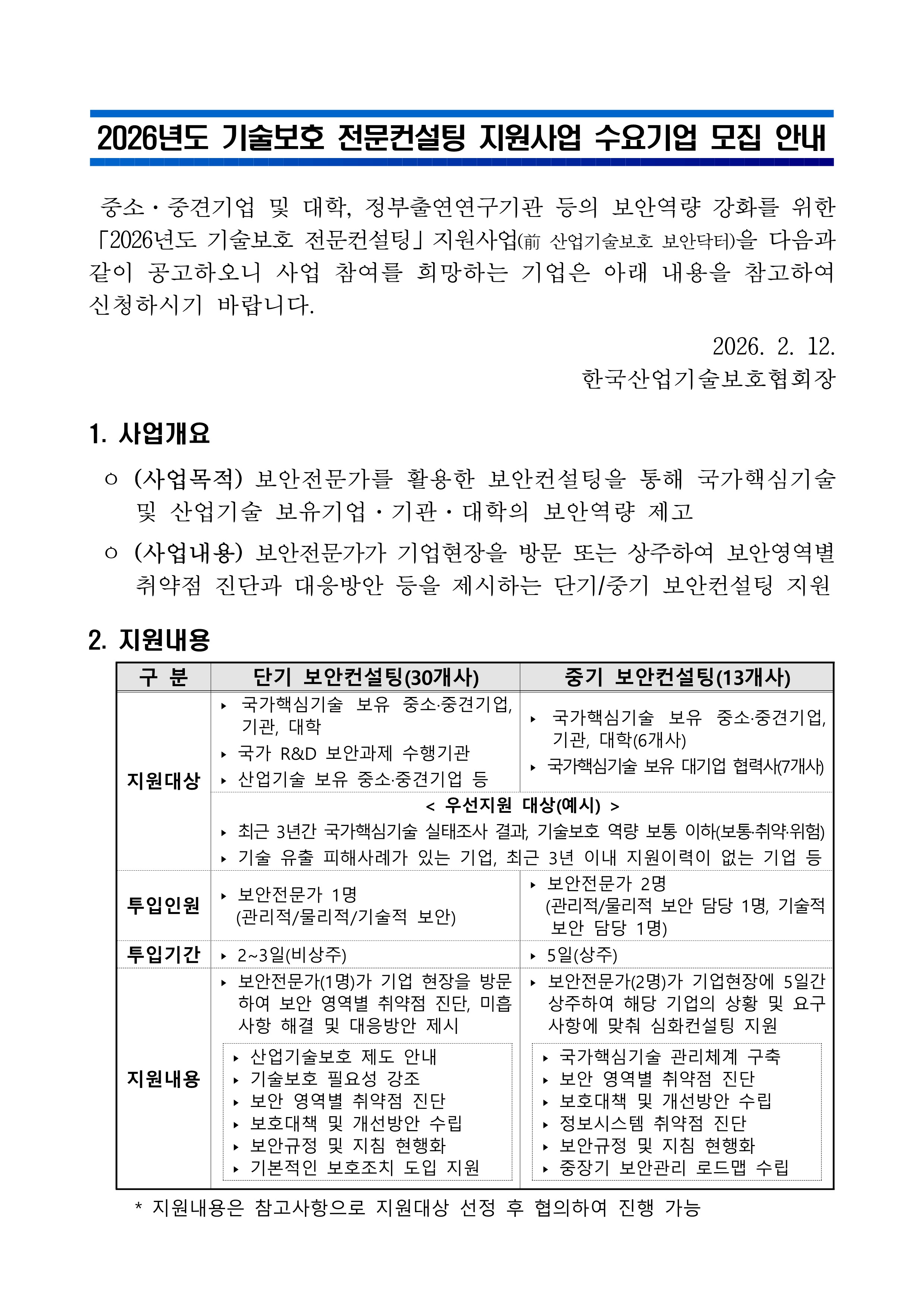 2026년도 기술보호 전문컨설팅 수요기업 모집 안내
