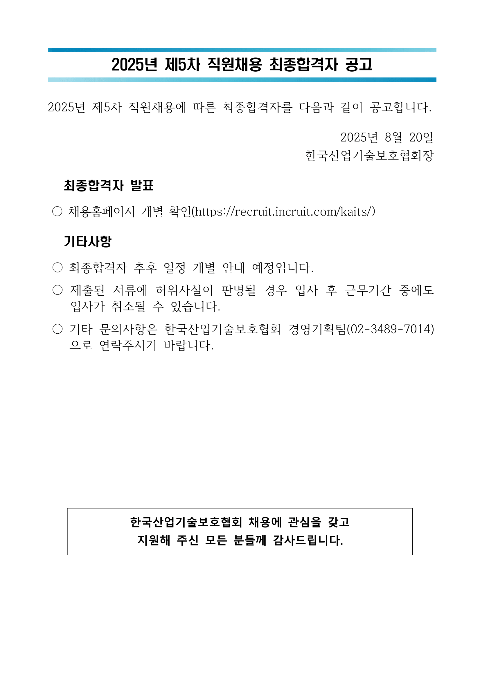 2025년도 제5차 직원채용 최종합격자 공고